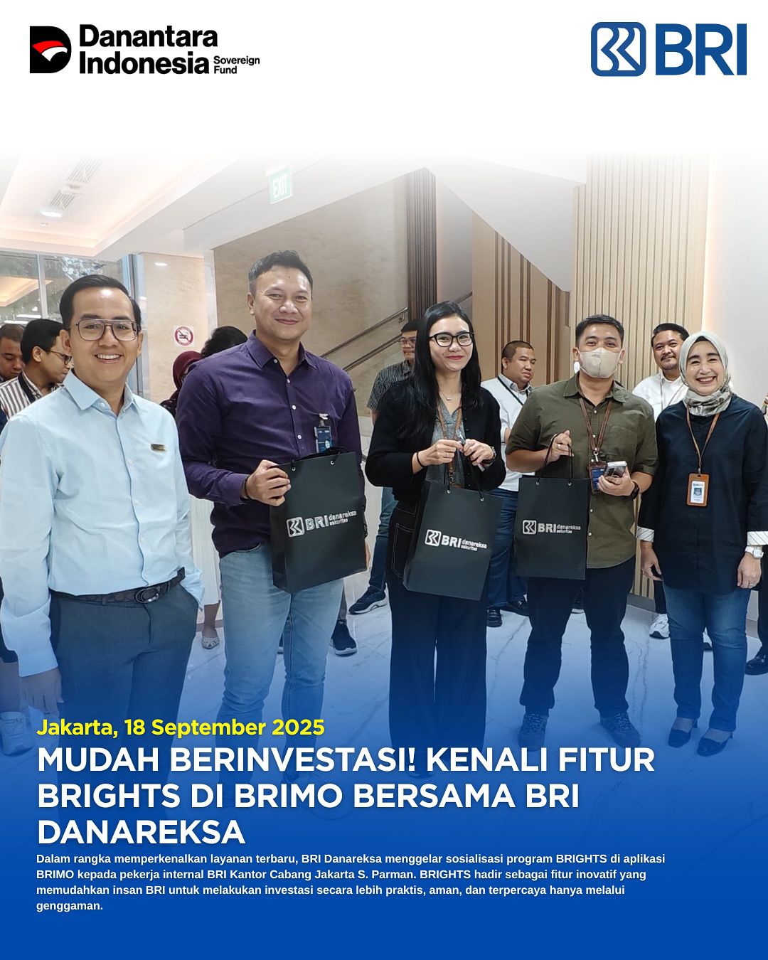 Tamperaknews.my.id – Jakarta, 18 September 2025 – PT Bank Rakyat Indonesia (Persero) Tbk melalui Kantor Cabang S. Parman berkolaborasi dengan BRI Danareksa memperkenalkan fitur investasi terbaru BRIGHTS di aplikasi BRImo. Rabu (24/09/2025)