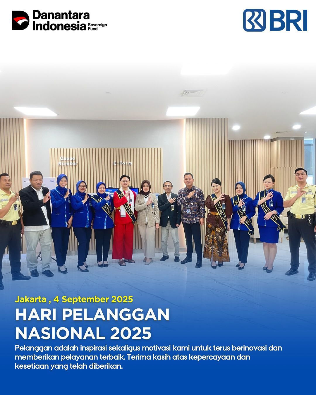 “Hari Pelanggan Nasional adalah momentum yang tepat bagi kami untuk mengucapkan terima kasih atas kepercayaan dan loyalitas nasabah. BRI senantiasa berkomitmen menghadirkan layanan yang prima, inovatif, dan sesuai dengan kebutuhan masyarakat. Melalui kegiatan ini, kami ingin menunjukkan bahwa nasabah adalah mitra utama dalam setiap langkah transformasi BRI,” jelas Yogie.