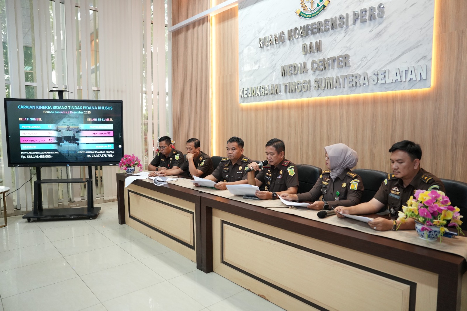 Tamperaknews.my.id – KEJATI SUMSEL – 09 Desember 2025, Wakil Kepala Kejaksaan Tinggi Sumatera Selatan Bapak Anton Delianto, S.H., M.H. di dampingi Asisten Intelijen sekaligus Plt. Asisten Tindak Pidana Khusus Kejati Sumsel, Kasi Penkum serta para Kasi Bidang Pidsus Kejati Sumsel menyampaikan Pers Rilis terkait Capaian Kinerja Bidang Tindak Pidana Khusus Kejaksaan Tinggi Sumatera Selatan Periode Januari – Desember 2025 dalam rangka memperingati Hari Anti Korupsi Sedunia (Hakordia) Tahun 2025.