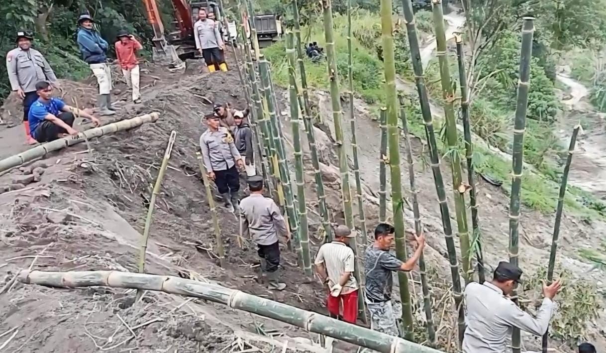 Ia menambahkan bahwa pemasangan bambu penahan tanah dilakukan sebagai solusi darurat sambil menunggu penanganan lanjutan dari instansi terkait. “Upaya ini memang bersifat sementara, kami berharap risiko longsor dapat diminimalkan dan jalan tetap aman dilalui,” tambahnya.