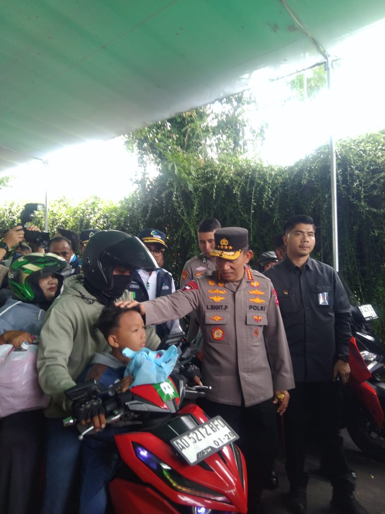 Saat temui para pemudik, Kapolri menyapa secara langsung para pemudik sekaligus juga membagikan bingkisan, sebagai bentuk rasa memberikan kenyamanan dan keamanan. Selain itu, dirinya juga memberikan himbauan agar dapat menjaga kesehatan dan mentaati serta menjaga keamanan selama berkendara.