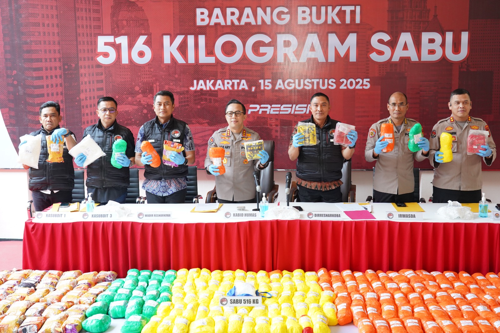 Direktorat Reserse Narkoba Polda Metro Jaya telah berhasil mengungkapan Sindikat Pelaku Peredaran Gelap Narkotika Jenis Sabu Kurang Lebih Setengah Ton / 516 Kilogram.