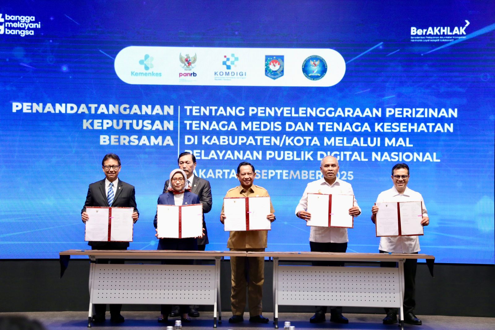 Usai sambutan, dilakukan penandatanganan Surat Keputusan Bersama oleh Mendagri, MenPAN-RB, Menteri Kesehatan, Wakil Menteri Komunikasi dan Digital, serta Kepala BSSN. Prosesi penandatanganan tersebut disaksikan langsung oleh Penasihat Khusus Presiden Bidang Digitalisasi dan Teknologi Pemerintahan Luhut Binsar Pandjaitan.