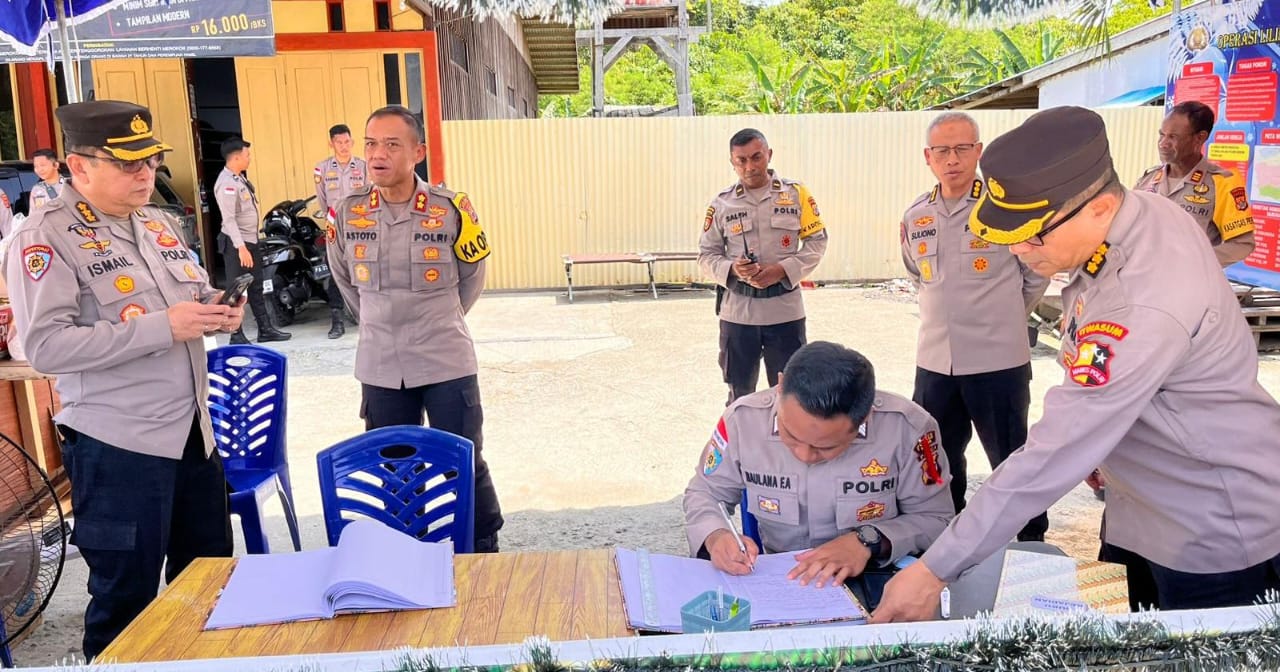 Pemeriksaan mencakup kehadiran anggota, kelengkapan seragam (Gampol), serta buku mutasi untuk memastikan setiap dinamika di titik strategis Jalan Trans Irian terpantau dengan baik.