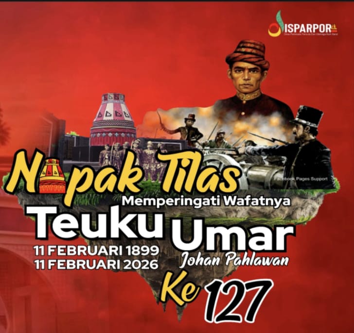 Tamperak News + Meulaboh — Pemerintah Kabupaten Aceh Barat melalui Dinas Pariwisata, Pemuda, dan Olahraga (Disparpora) akan menggelar Napak Tilas Teuku Umar ke-127 dalam rangka memperingati wafatnya Pahlawan Nasional Teuku Umar, yang gugur pada 11 Februari 1899 di Suak Ujong Kalak, Kecamatan Johan Pahlawan.