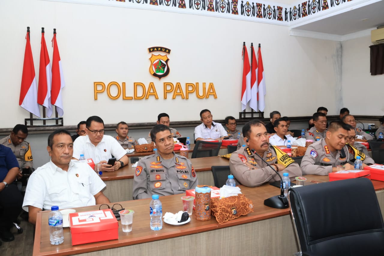 Tamperaknewsmy.id – Jayapura – Kapolda Papua, Irjen Pol. Patrige R. Renwarin, S.H., M.Si., bersama jajaran Pejabat Utama (PJU) Polda Papua menghadiri kegiatan Rilis Akhir Tahun (RAT) Polri 2025 yang dipimpin langsung oleh Kapolri Jenderal Polisi Drs. Listyo Sigit Prabowo, M.Si., secara virtual (Zoom Meeting) dari Aula Cenderawasih Mapolda Papua, Selasa (30/12/25).