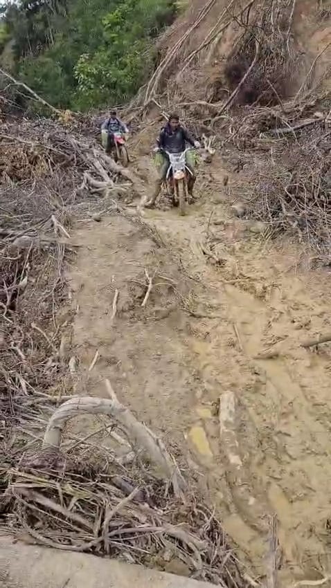 Sepanjang perjalanan, sejumlah titik jalan tertutup material tanah dan lumpur. Bahkan, beberapa akses jalan antar desa dilaporkan putus total. Kondisi ini membuat kendaraan roda empat tidak dapat melintas, sementara kendaraan roda dua harus berjibaku melewati medan yang berat dan berbahaya. Curah hujan yang masih tinggi semakin memperparah kondisi jalur yang dilalui.