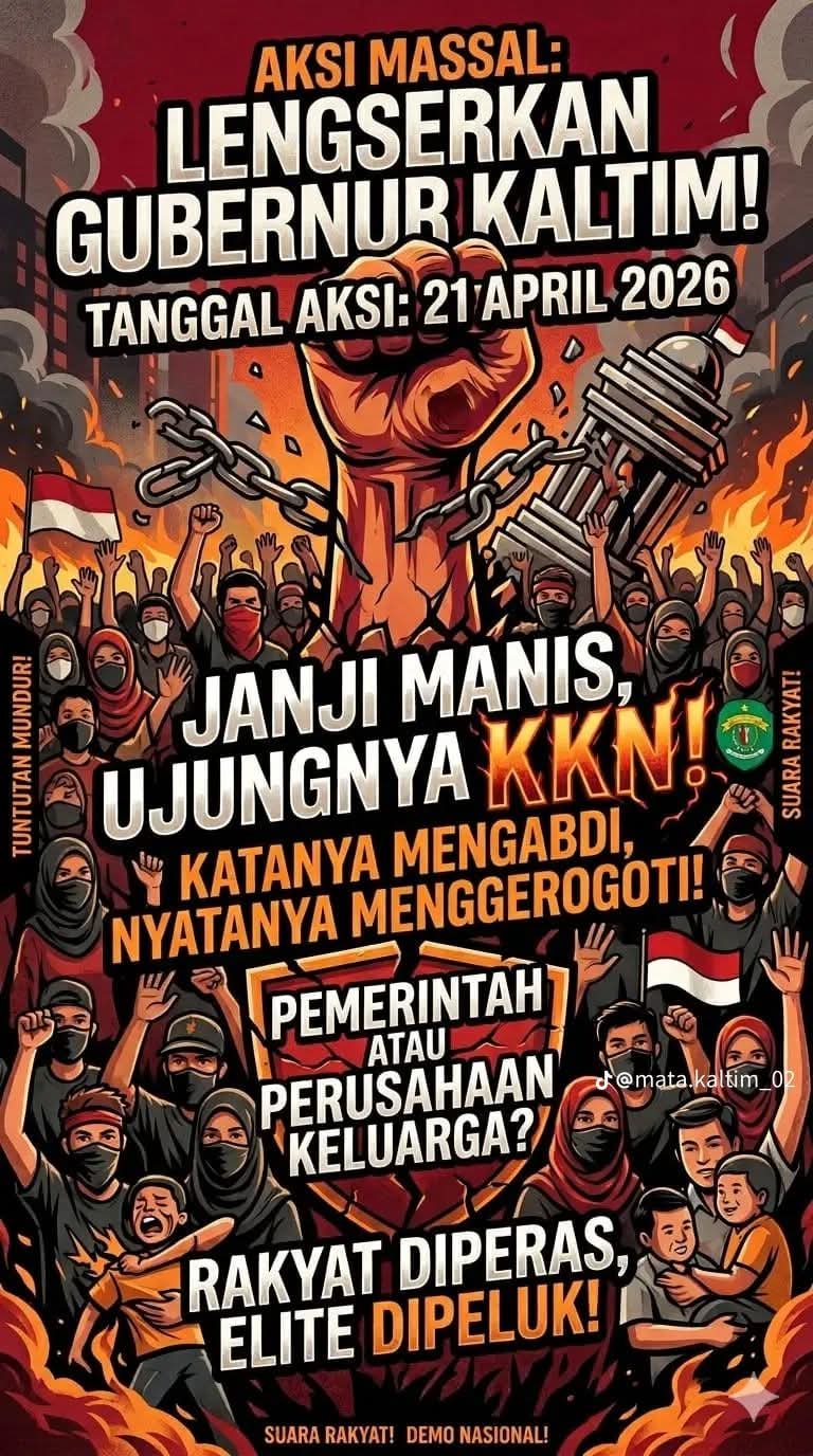 Tamperak News – Samarinda, Kaltim – Suara penolakan terhadap kepemimpinan Gubernur dan Wakil Gubernur Kalimantan Timur, Rudy Mas’ud dan Seno Aji, semakin keras terdengar. Aliansi Perjuangan Masyarakat Kalimantan Timur memastikan akan menggelar demonstrasi besar-besaran pada 21 April 2026 mendatang.