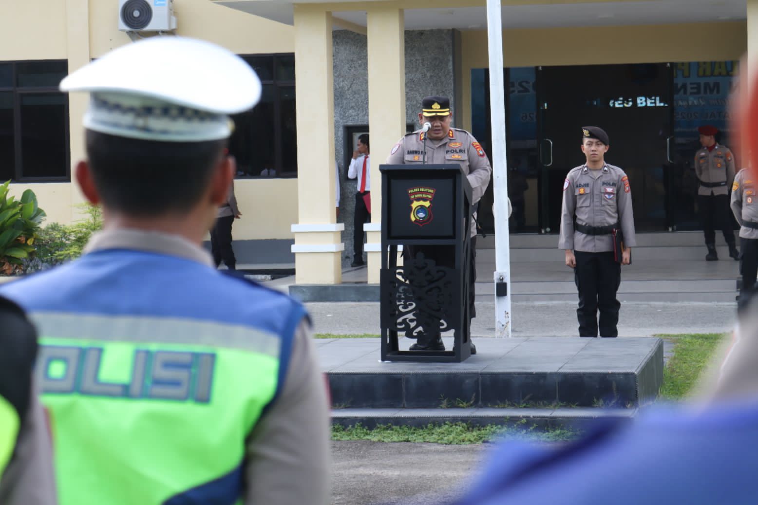 Upacara dipimpin langsung oleh Kapolres Belitung AKBP Sarwo Edi Wibowo, S.I.K. selaku Inspektur Upacara dan diikuti oleh para pejabat utama, personel dan ASN Polres belitung.